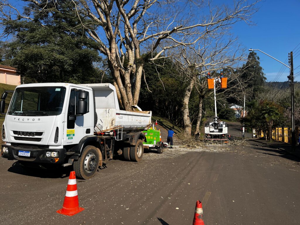 Nesta quarta-feira (23), a Copel está realizando uma operação de manejo de vegetação na área urbana de Porto Vitória, em parceria com a Prefeitura Municipal. A ação visa prevenir quedas de energia causadas pelo contato de galhos e árvores com a rede elétrica, situação que responde por cerca de 50% dos desligamentos registrados.